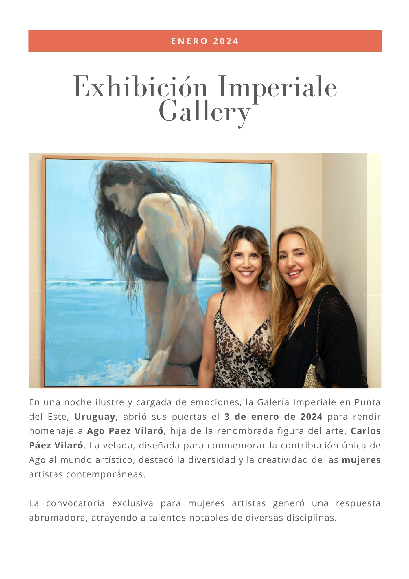 En una noche ilustre y cargada de emociones, la Galería Imperiale en Punta del Este, Uruguay, abrió sus puertas el 3 de enero de 2024 para rendir homenaje a Ago Paez Vilaró, hija de la renombrada figura del arte, Carlos Páez Vilaró. La velada, diseñada para conmemorar la contribución única de Ago al mundo artístico, destacó la diversidad y la creatividad de las mujeres artistas contemporáneas.